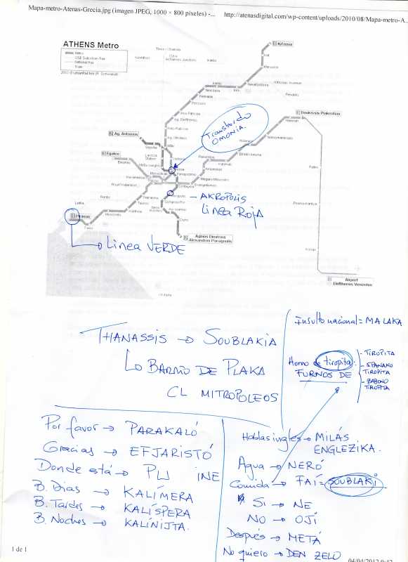 Buenas, aqui pongo lo que me explico mi jefe para llegar a la acropolies desde el pireo, se coge el metro en pireo (linea verde), en omonia se hace transbordo a la linea roja con dirección aghios dimitrios, y nos bajamos tres paradas despues en la parada que se llama akropolis, he escaneado el domcumeto y espero que se vea, incluyo unas palabras de uso comun en griego con la pronunciación fonetica, y me recomendo que comiese en el barrio de plaka, en un sitio que se llama thanassis, que esta en la calle metropoleos,