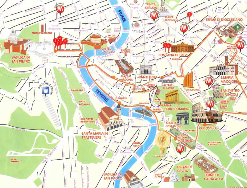 Te pongo un recorte del plano que nos dieron en el autocar, aparcamos en la zona marcada en azul, en la calle Via del Teatro Marcello, muy cerca de la plaza Venecia y del Teatro Marcello, por cierto la Fontana de Trevi está en obras, vacía y rodeada de vallas, y dicen que va para largo.