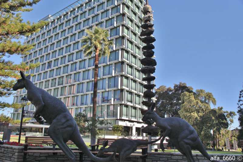 Atravesamos una de las calles más comercial y concurrida, Murray St ,dirección al parque marítimo. Esta ciudad es más pequeña que Melbourne, pero mantiene un parecido, grandes rascacielos de cristal haciendo sombra a pequeñas casas unifamiliares o iglesias. Que contraste !!