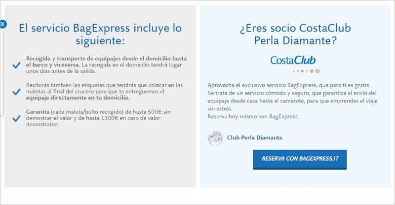 El Bag Express, los residentes en España, servicio de pago o socios Perla Diamante gratuito, lo pueden reservar a través de My Costa o por teléfono +3908119706711, de lunes a viernes de 9:00 a 19:00. El servicio del Bag Express en puerto Español que embarque y desembarque sólo en Barcelona, en Francia e Italia los puertos arriba mencionados.