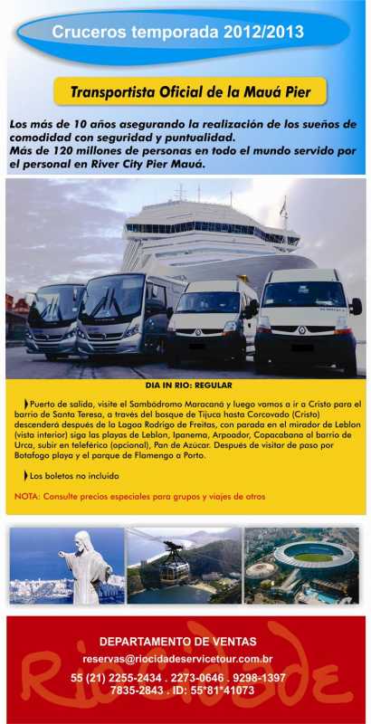 A LOS QUE PREGUNTABAN POR RIOCIDADE, NOSOTROS CONTRATAMOS CUANDO BAJAMOS CON ELLOS, NOS COBRARON 80 REALES X PERSONA + 27 ENTRADA AL CRISTO, Y EL QUE QUERIA IR A PAN DE AZUCAR 53 REALES, LAS ENTRADAS SE PAGABAN ALLI.