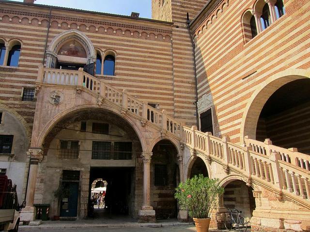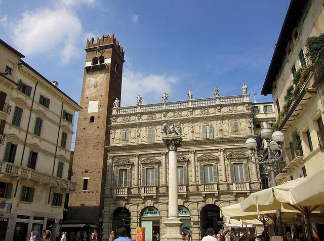 El palacio, también conocido como Palacio de la Alcaldía , fue durante siglos el centro del poder político. Al lado de este palacio surge la elevada Torre de los Lamberti , una torre medieval que ha llegado a ser la más elevada de Verona (mide 84 metros). Se conoce por los materiales diferentes con la cual fue construida, que son toba ladrillo, ladrillo y mármol. Se puede subir a la torre a través de unas escaleras, o gracias a un ascensor. Desde la cumbre de la torre, se goza de una maravillosa visión de toda la ciudad , y en limpios días de sol se pueden ver hasta los montes alrededor. En la torre se encuentran dos campanas: la primera llamada “Marangona” que servía a señalar las horas o indicar alarmas, y la segunda llamada “Rengo” que se utilizaba para reunir el Consejo comunal.