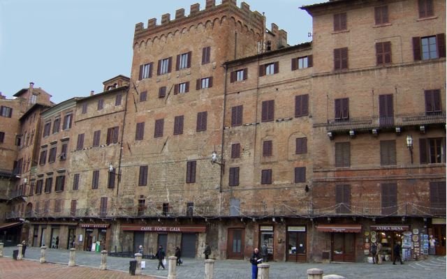 Es la plaza que mejor caracteriza a Siena en el mundo, considerada la “plaza más bella del mundo” por Montaigne, además de que es el corazón mismo de toda la ciudad. las 9 “contradas” o zonas de la ciudad. Sus orígenes datarían en el 1169, y era un espacio dedicado al mercado de la ciudad. La pavimentación de la Plaza comenzó en 1327 y finalizó en 1349, con una subdivisión de nueve partes en memoria del gobierno de los “Nueve Señores”, Su piso es de pequeños ladrillos rojos que forman una enorme concha cóncava, como si fuera una verdadera concha marina dividida en 9 partes que simbolizan