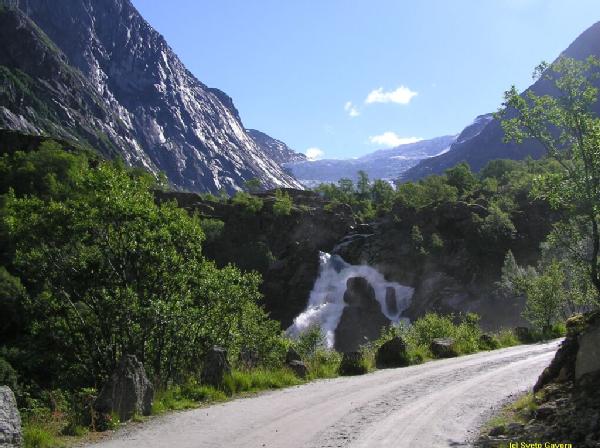 Briksdal es un valle escondido. A la derecha, se puede ver la cascada Vollfossen. Para llegar a la lengua del claciar Briksdal, qtiene menos de 45 minutos a pie desde el aparcamiento. Esta caminata se puede hacer fácilmente, incluso con niños pequeños (caminar sobre el hielo es bastante más arriesgado).
