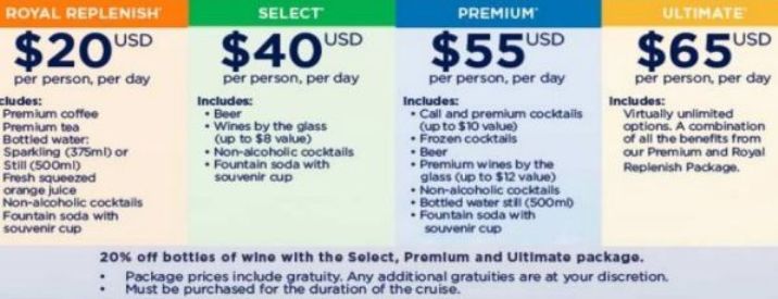 Royal paquete Vino Caribe permite a los clientes comprar un número predeterminado de selección especial de línea de vinos y ahorrar hasta un 25% del precio normal en la carta de vinos. A partir de marzo de 2013, hay un nuevo "Wine and Dine" paquete llamado "Premium Platinum Package" - su costo depende de la cantidad de botellas [debajo de los precios son sin el 15% de propina añadido]: