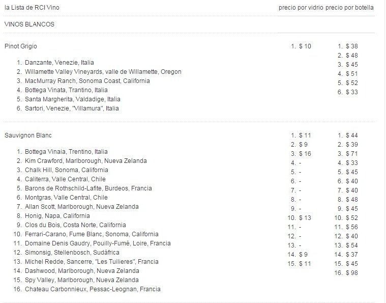 (BLANCO) Pinot Grigio ("Danzante"), Sauvignon Blanc ("Caliterra"), Chardonnay ("Aussières Blanc por Barons de Rothschild" y "Castle Rock"), "Zinfandel / Beringer"