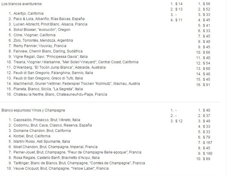 (BLANCO) "Chateau Ste Michelle", "Danzante", "Caliterra", "Ferrari-Carano" (Fume Blanc), "Dashwood", "Aussières Blanc" (Rothschild), "Castle Rock", "Kendall-Jackson" ( VR), "Solaire (Mondavi)," Enigma "," Beringer "