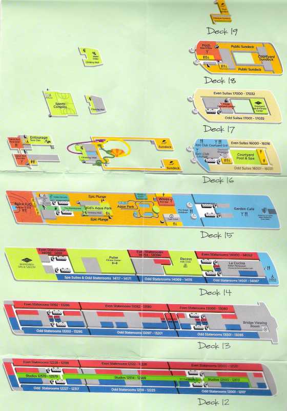 os pongo el mapa de las cubiertas, como ya os conté para saber donde estais mirar la moqueta, en el mapa tambien esta separado por ROJO (camarotes pares) y AZUL (camarotes impares.