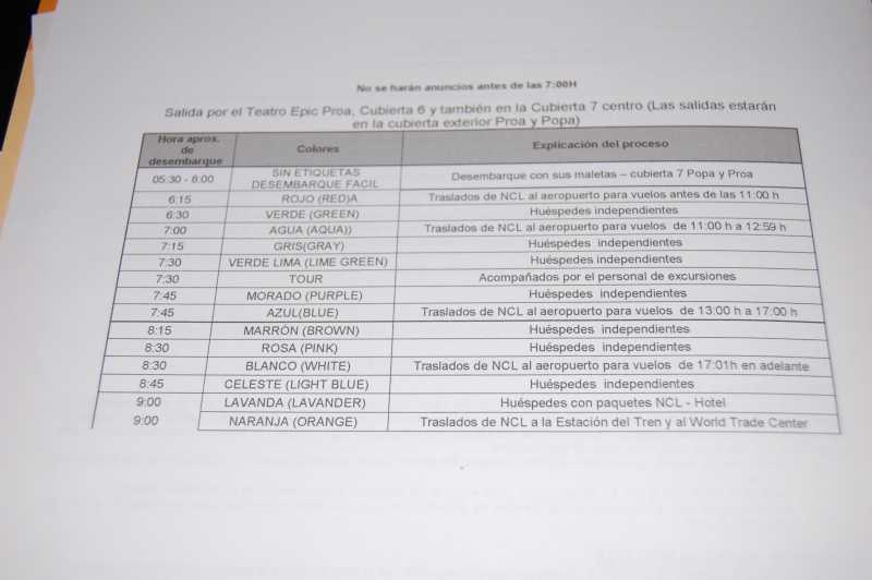 ImmaV escribió: Segun el programa del último dia, se puede desembarcar a partir de la 5:30 hasta las 9:00 para el desembarque facil, es decir cuando tu te llevas las maletas y a partir de las 6:15 cada quince minutos ha una salida , segun el color de tu etiqueta, Nosotros en los dos viajes, escogimos bajarnos las maletas nosotros, desayunamos en el buffet hacia las 9 bajamos del barco, nunca hemos tenido problemas. Si te interessa te puedo passar los horarios del ultimo dia.